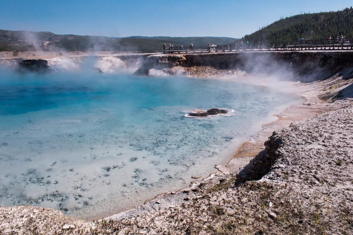 Yellostone není místo na delší procházky, prakticky se mačkáte na dřevěných prnech podél tyrkysových jezerek o 90 stupních a čekáte, až vás překvapí další gejzír. Tady ale jdou davy turistů stranou, jakmile gejzíry začnou svou show, je vám jedno, jestli kolem vás je dalších tisíc diváků.
