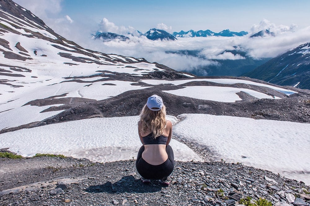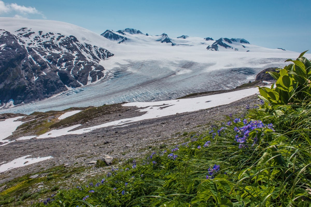A tak jsme vyrazili. Vzali jsme to vražedným tempem. Celkově ta túra měla být na 6-8 hodin. My ji šli 4 hodiny. Když jsme byli ve čtvrtině cesty nahoru, obloha se už vyjastňovala. Za chvíli na obloze nebyl jediný mrak a my jsme si užívali modré nebe, které kontrastovali s bílým ledovce a fialovými květinami, které byly rozseté všude kolem. Za rok, který jsme strávili v Severní Americe, jsme toho viděli hodně, ale zatím nic tak krásného jako při tomhle výšlapu. Když dojdete nahoru, údajně se vám naskytne obrázek, jak vypadala doba ledová. Drsná a úchvatná. Znova jsme si potvrdili, že nejlepší věci jsou zadarmo.