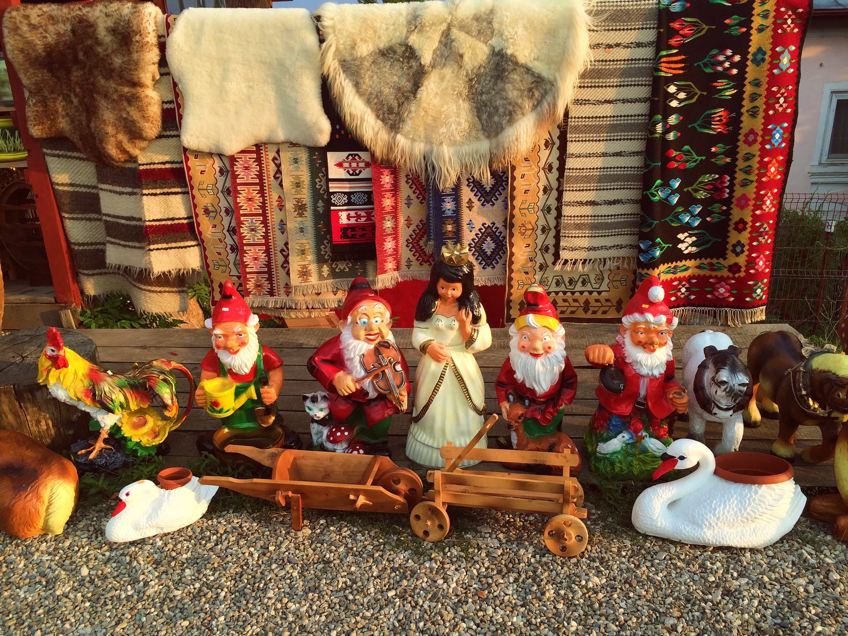 Hodinu před Targu Jiu, když slunce chytalo svou nejkrásnější zlatavou barvu, jsme dojeli do vesnice. Její jméno jsem hned zapomněla, možná jsem si ho ani nevšimla, ale na značku, která hlásila “turistické centrum” nikoliv. Turistické centrum znamenalo Trpaslíkov. Jak z českých hranic, stánky s dřevenými lžícemi, kožešinami a trpaslíky všech možných póz a výrazů se táhly přes celou vesici. To vše zalité krásným zlatavým tónem pomalu klesajícího slunce, které se prodíralo nad vesnicí, jejíž okolí bylo schované pod bouřkovými mraky. Zastavili jsme a šli jsme se projít. Směšně poetické – nebe protrhané jen nad Trpaslíkovem a zbytek zahalen v černofialové bleskové temnotě. Slunce ozařovalo místo kýče jak svatyni. Byla to taková božská romantika s trpaslíky. S prvními kapkami deště jsme odjeli.